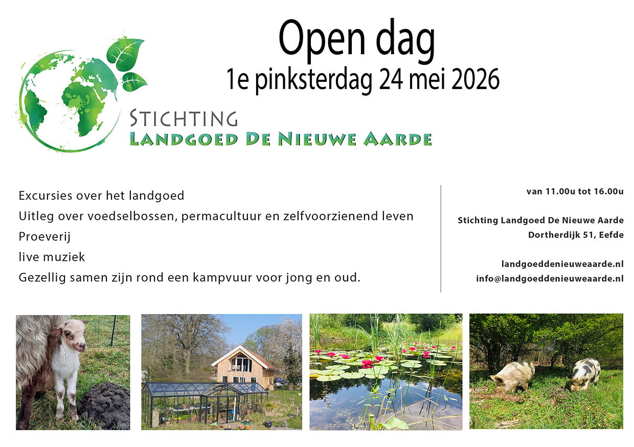 Stichting landgoed de nieuwe aarde Dortherdijk 51, Eefde, Nederland1e pinksterdag zondag 24 mei 2026 is er een Open Dag op het landgoed van 11.00 u tot 16.00u. Er zijn die dag rondleidingen over het landgoed.Uitleg over voedselbossen, permacultuur en zelfvoorzienend leven en wat voor ons leven op de nieuwe aarde inhoud.Er is een proeverij van allerlei eigen gemaakte produkten zoals brandnetelbier en paardenbloemenjam.Er